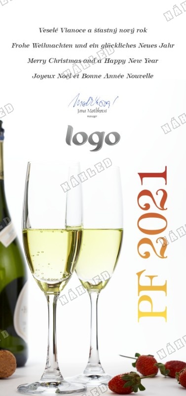 Novoroční přání s lahví a skleničkami šampaňského